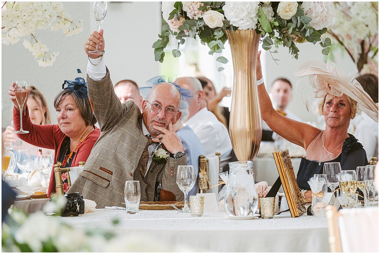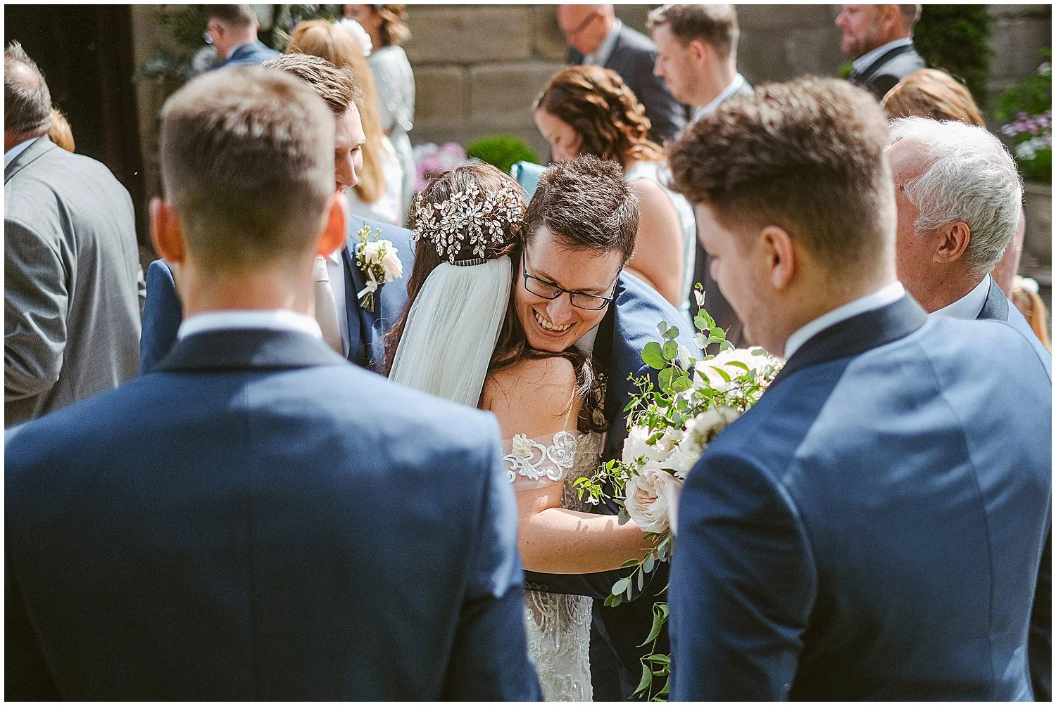 Holly and Chris went all out for their wedding at Wynyard Hall with no detail spared. It was a feast for the eyes, with stunning florals, jaw-dropping wedding breakfast tables, and a wedding cake that was a piece of art. Holly looked beautiful in her fit and flare, off the shoulder wedding dress, long veil and vintage hair comb, and Chris looked smart as a dart in his tailored navy suit and champagne tie. The day started out fairly overcast but the sun came out as they left the chapel, and they and their guests enjoyed their drinks reception outside on the hall’s extensive terrace overlooking the lake. After some fabulous speeches and their lavish wedding breakfast, the conservatory was quickly transformed for their evening reception, perfect for dancing the night away!
